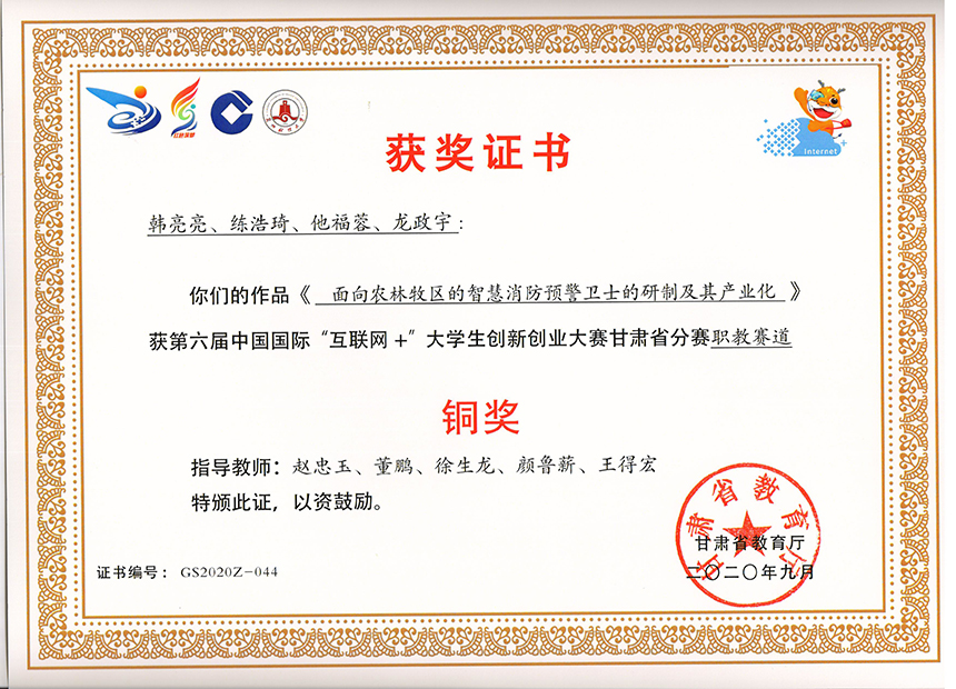 第六屆中國國際“互聯(lián)網(wǎng)+”大學(xué)生創(chuàng)新創(chuàng)業(yè)大賽甘肅省分賽職教賽道《面向農(nóng)林牧區(qū)的智慧消防預(yù)警衛(wèi)士的研制及其產(chǎn)業(yè)化》