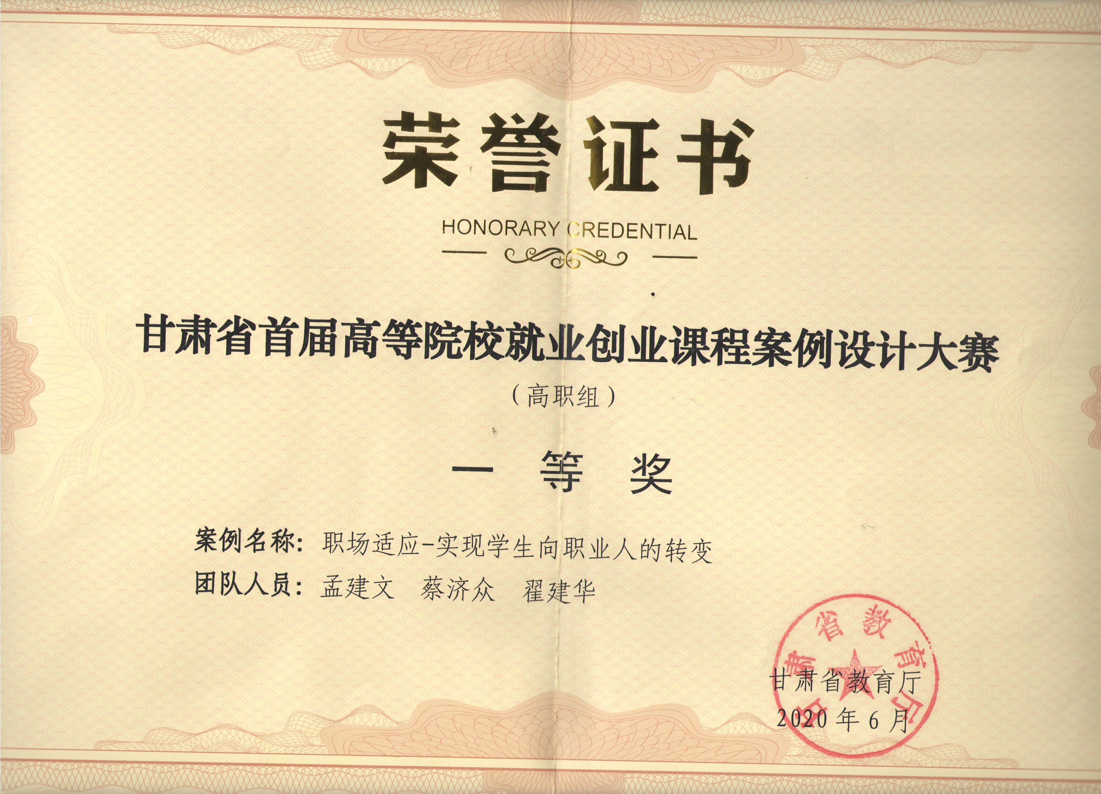 項(xiàng)目組成員蔡濟(jì)眾2020年6月撰寫案例《職場適應(yīng)—實(shí)現(xiàn)學(xué)生向職業(yè)人的轉(zhuǎn)變》榮獲甘肅省首屆高等院校就業(yè)創(chuàng)業(yè)課程案例設(shè)計(jì)大賽(高職組)一等獎(jiǎng)