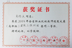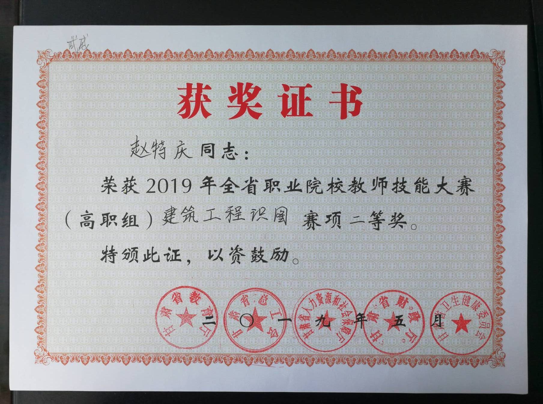 2.項(xiàng)目組成員趙特慶2019年5月榮獲2019年全省職業(yè)院校教師技能大賽(高職組)建筑工程識圖賽項(xiàng)二等獎(jiǎng)