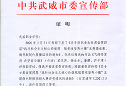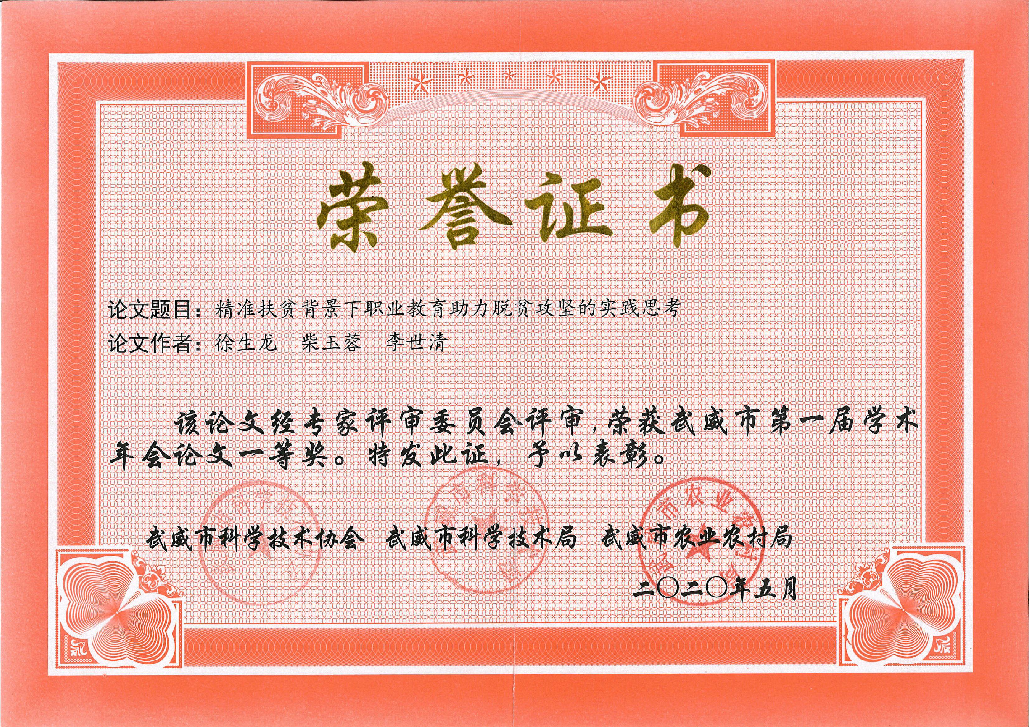 項(xiàng)目組成員徐生龍撰寫的論文《精準(zhǔn)扶貧背景下職業(yè)教育助力脫貧攻堅(jiān)的實(shí)踐思考》被評為武威市第一屆學(xué)術(shù)年會論文一等獎(jiǎng)
