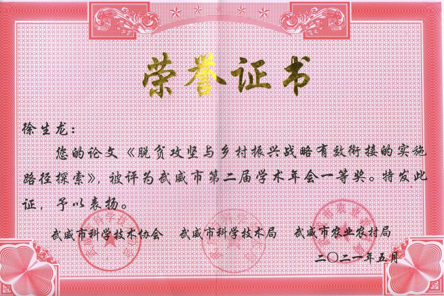 8.項(xiàng)目負(fù)責(zé)人徐生龍撰寫的論文《脫貧攻堅(jiān)與鄉(xiāng)村振興戰(zhàn)略有效銜接的實(shí)施路徑探索》被評為武威市第二屆學(xué)術(shù)年會一等獎(jiǎng)