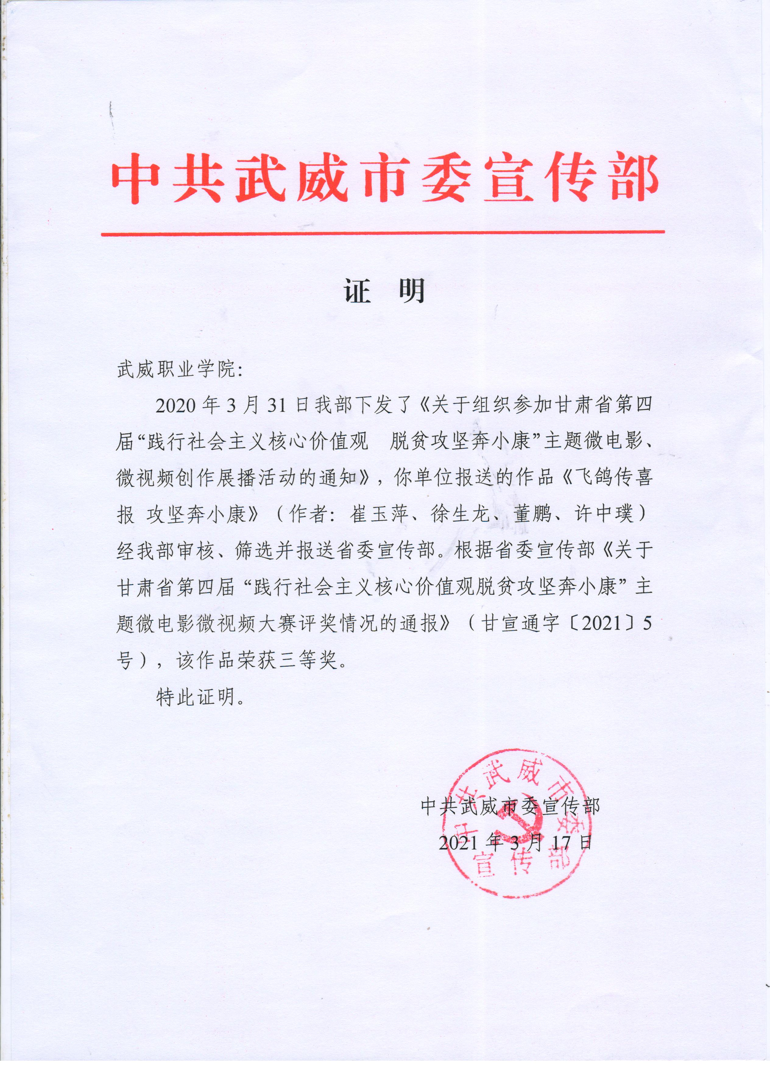 9.項(xiàng)目組負(fù)責(zé)人徐生龍、崔玉萍、董鵬2021年3月制作的《飛鴿傳喜報(bào) 攻堅(jiān)奔小康》在《關(guān)于甘肅省第四屆“踐行社會主義以核心價(jià)值觀脫貧攻堅(jiān)奔小康”主題微電影視頻大賽》榮獲三等獎(jiǎng)