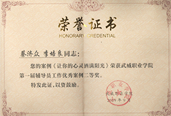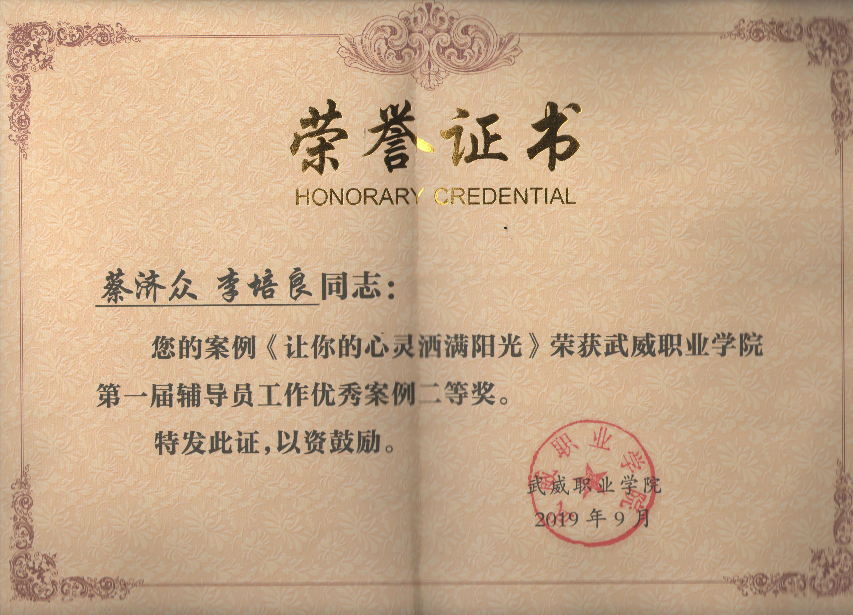 12.項(xiàng)目組成員蔡濟(jì)眾2019年9月撰寫的《讓你的心靈灑滿陽光》榮獲武威職業(yè)學(xué)院第一屆輔導(dǎo)員工作優(yōu)秀案例二等獎(jiǎng)